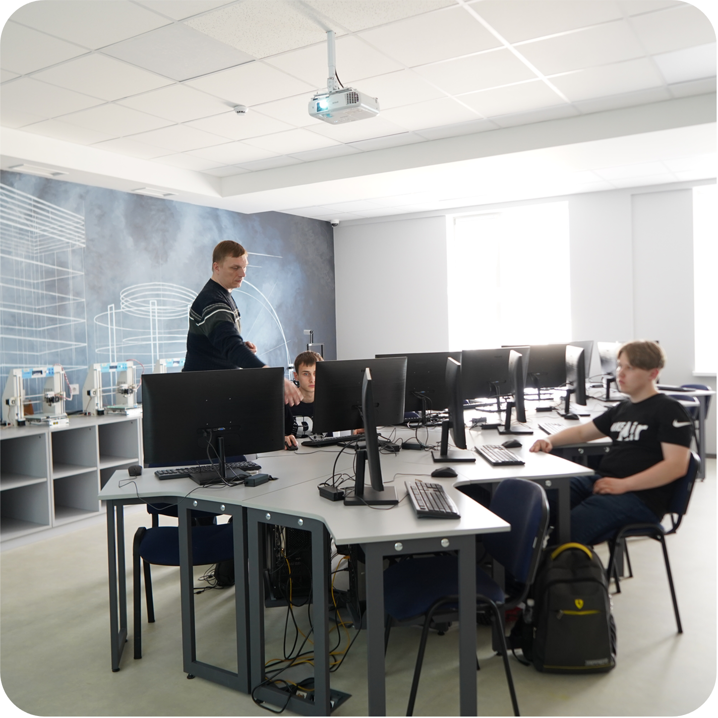 Кабінети для занять оснащені найсучаснішим комп'ютерним обладнанням, 3-D принтерами, тому процес навчання проходить легко й комфортно.